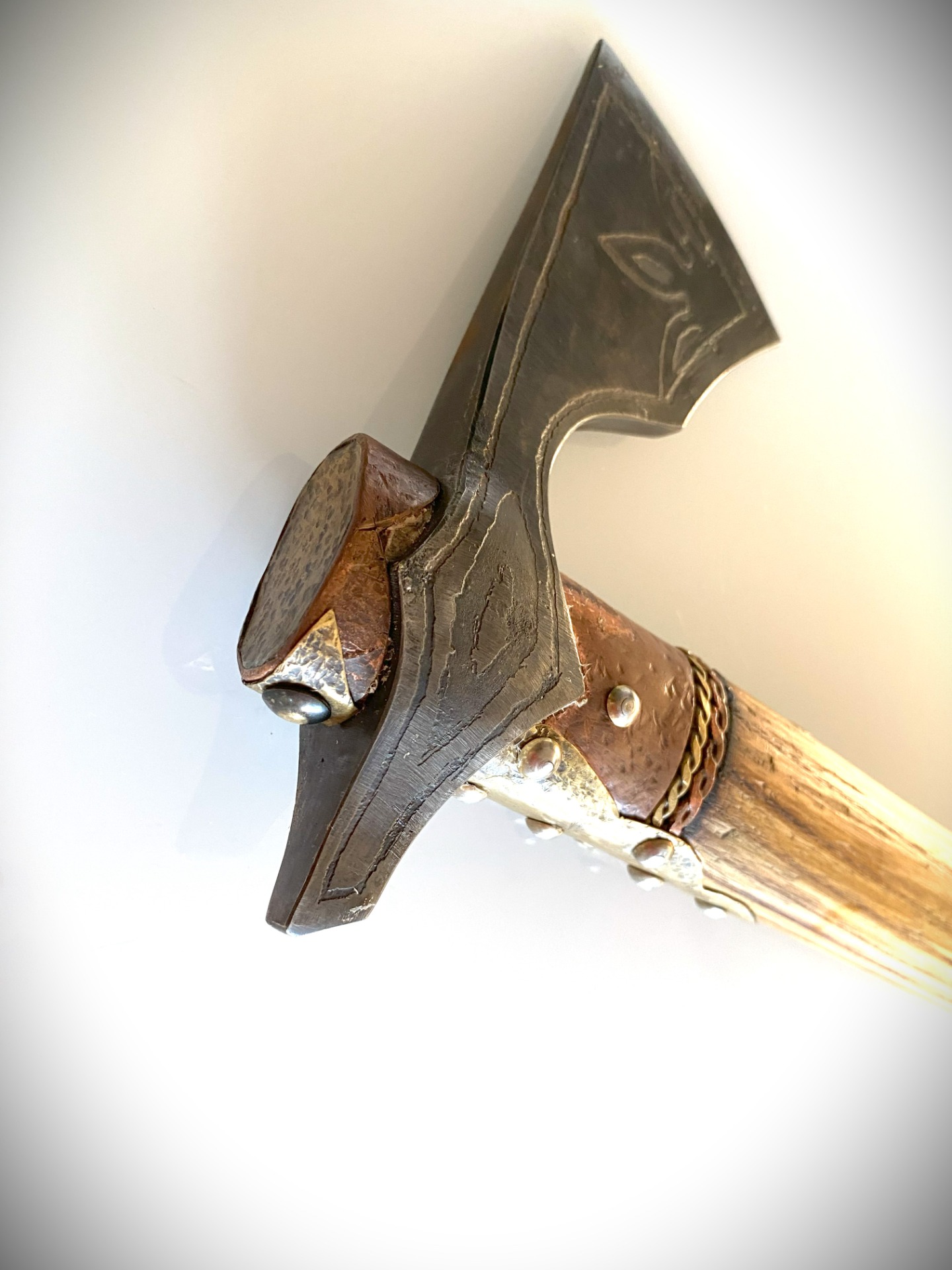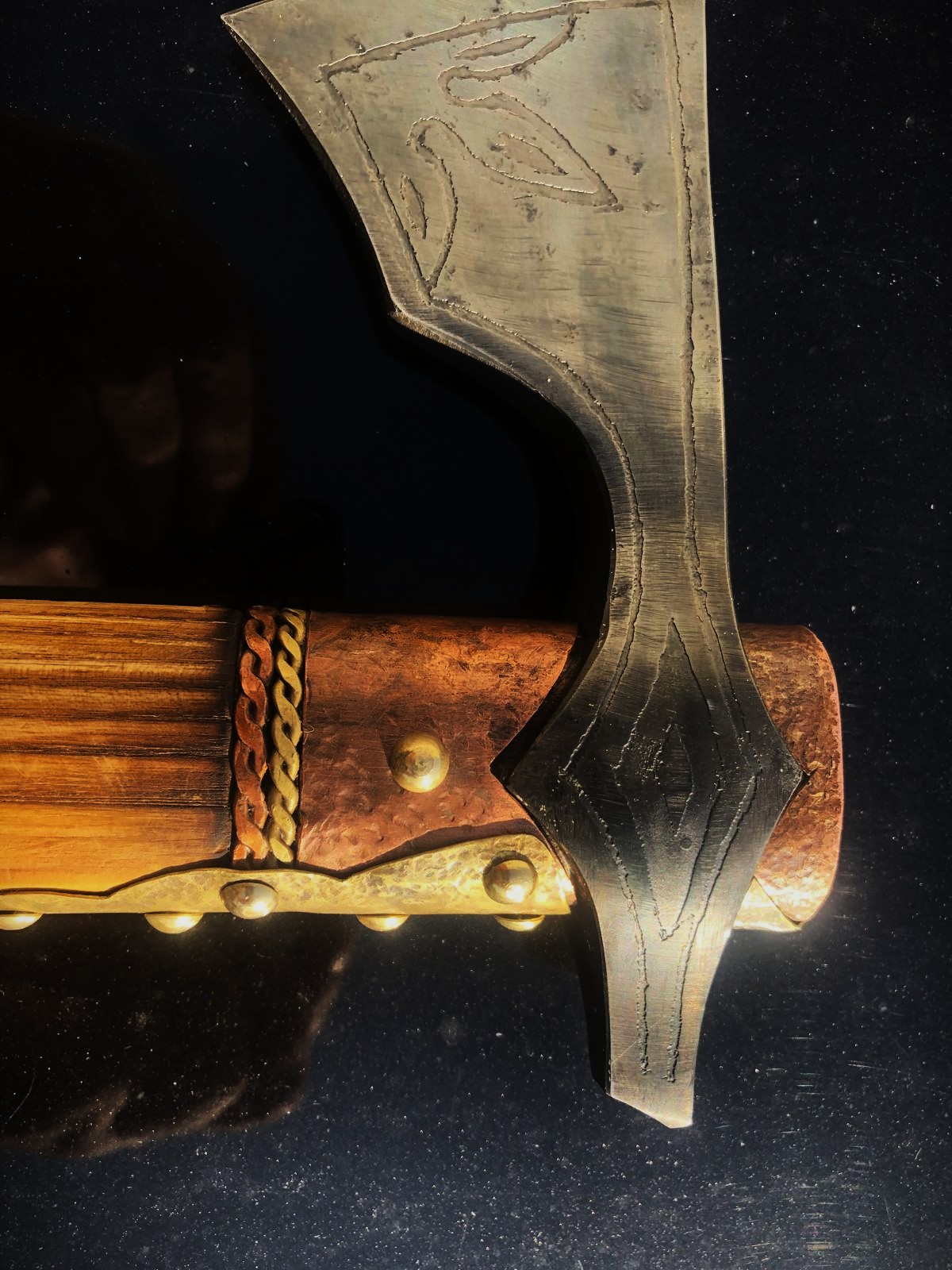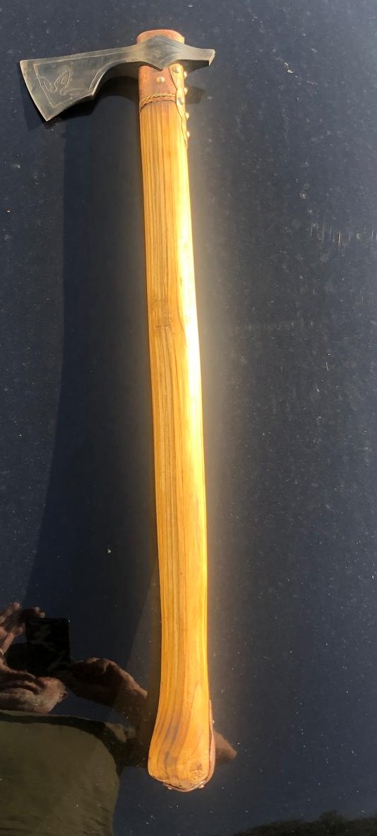 Historická sekera VARIAG ručne kovaná, materiál oceľ, rúčka jaseň. Veľmi ostrá a pevná. Zdobenie kombinácia mosadz a meď.