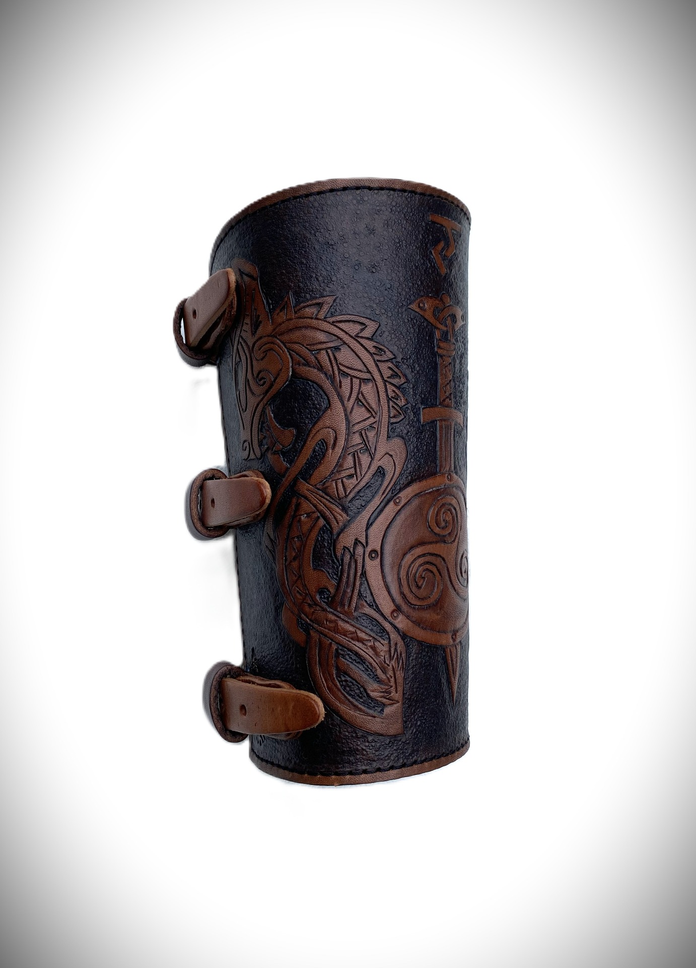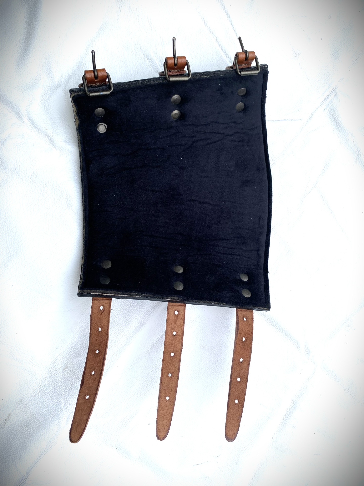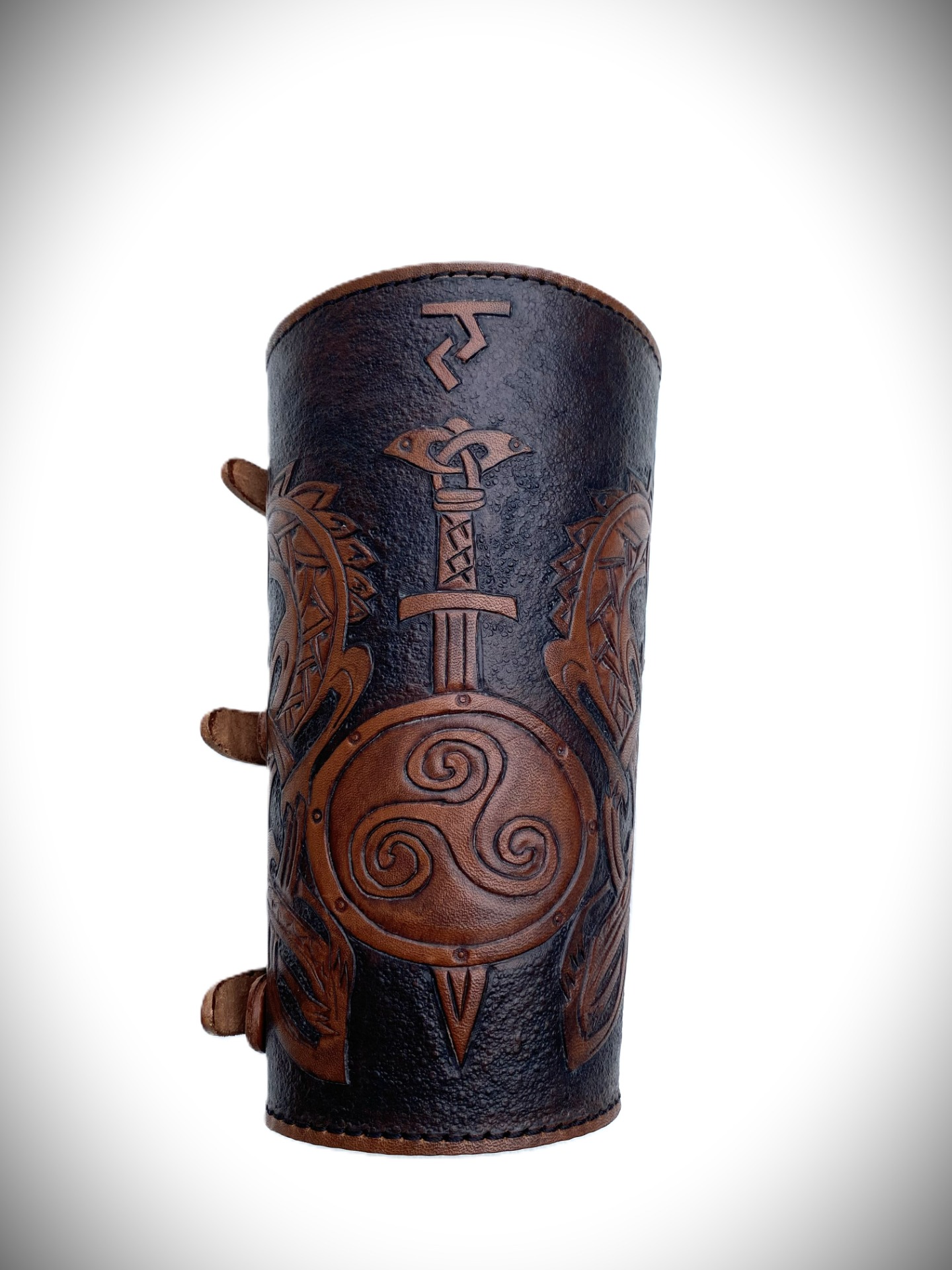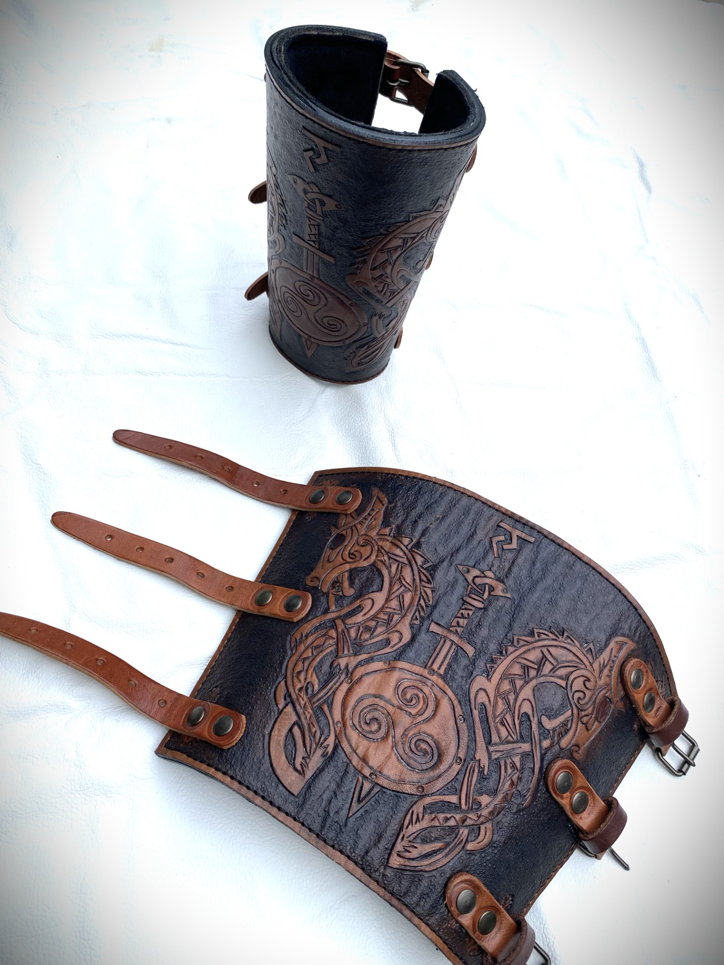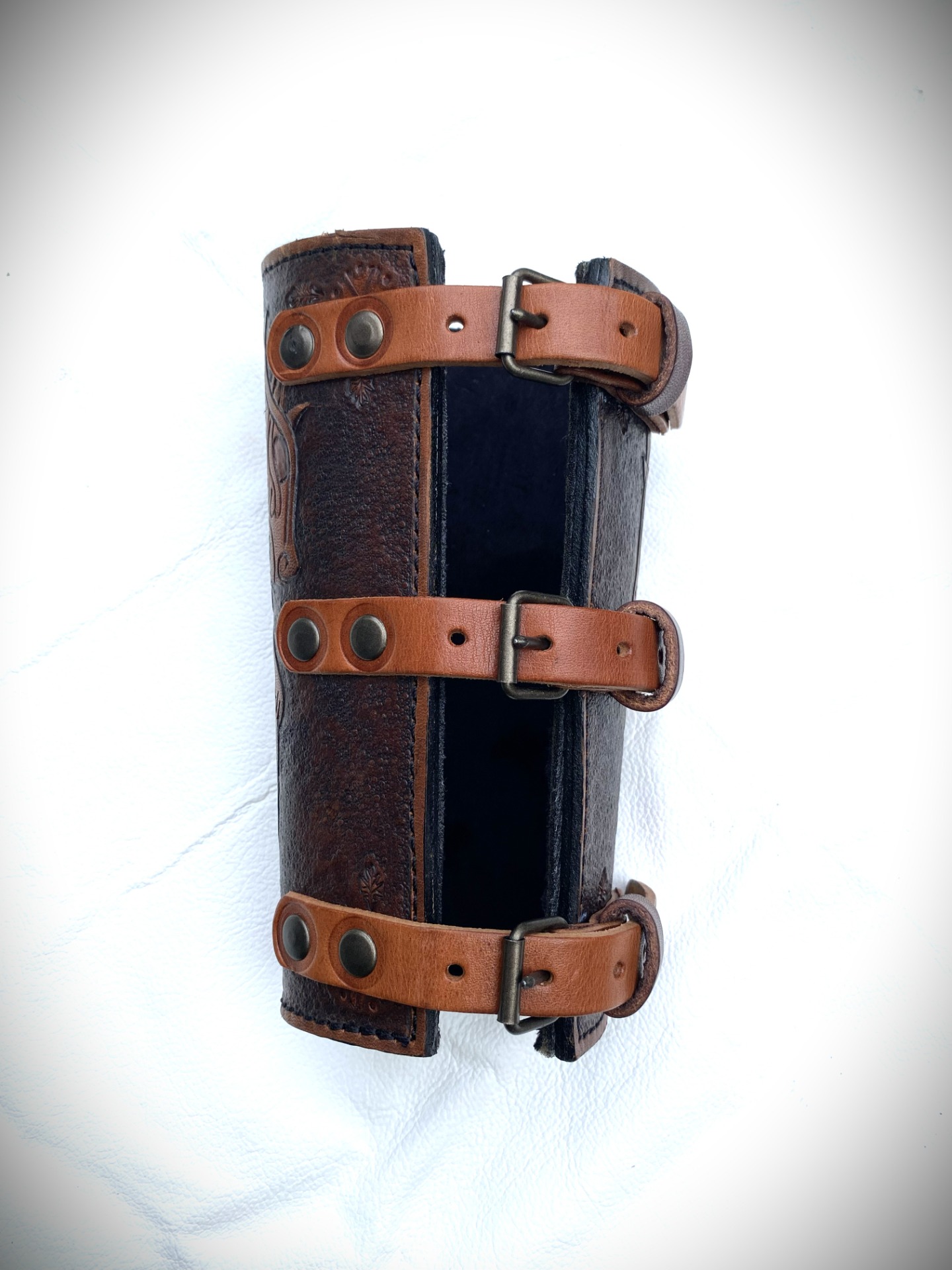 Nátepník na predlaktie 2 kusy, upínanie sa prispôsobí hrúbke ruky. Vyrobené z kože, vnútorná strana podšitá mäkkým flisovým materiálom. Dodáva sa bez zdobenia, možnosť ozdobiť požadovanými prvkami. Cena zdobenia je závislá od pracnosti.
