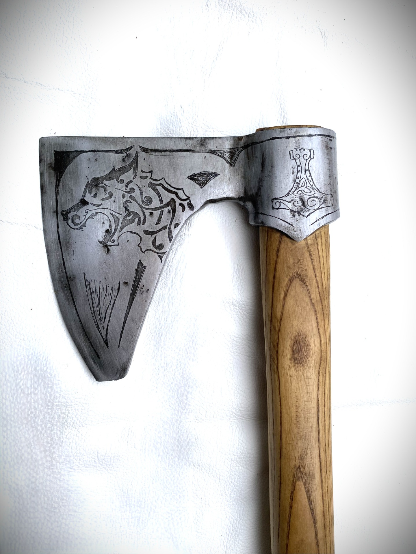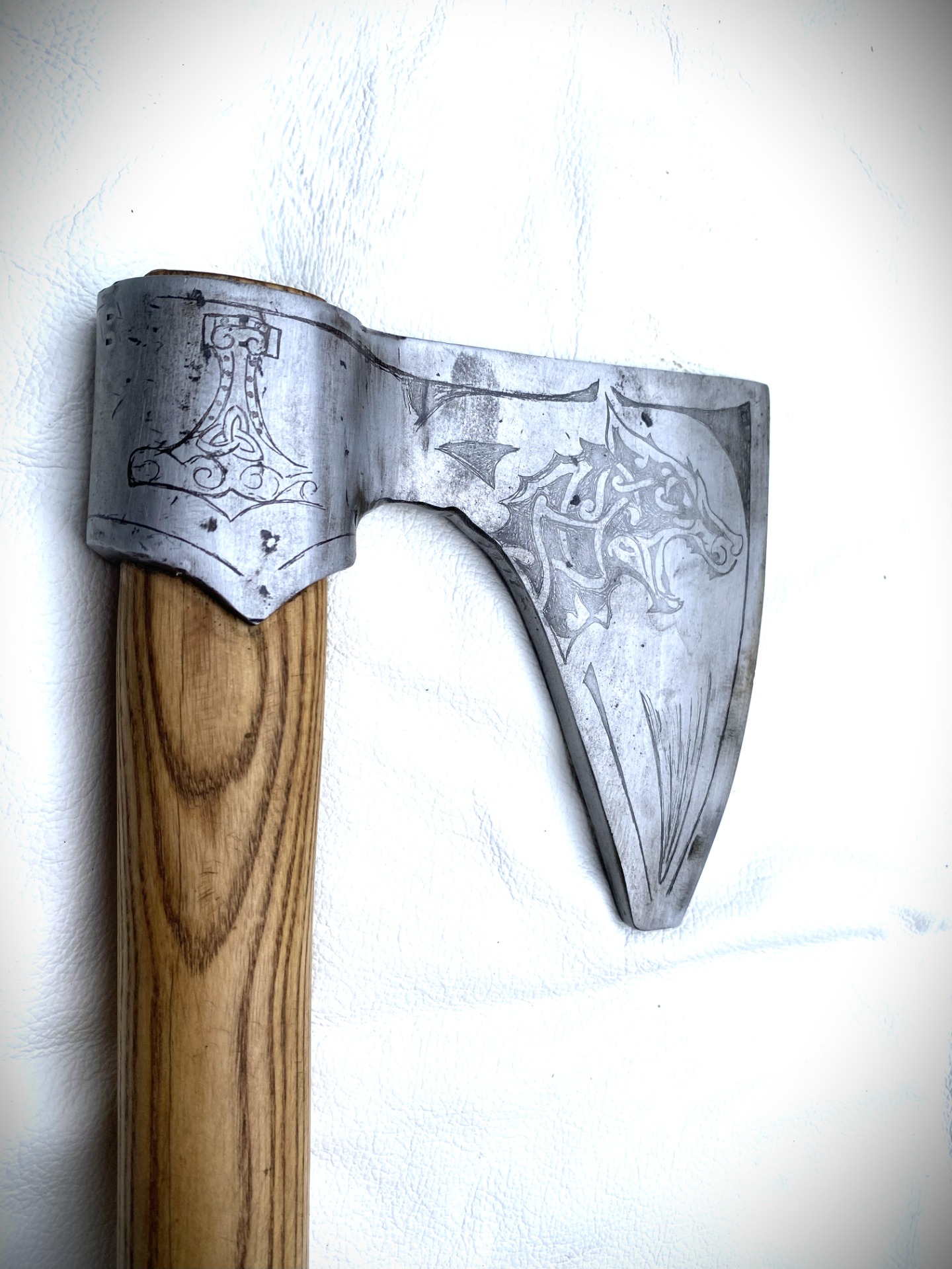 Bojová historická sekera bradatica, používaná v období dobývania Anglicka a Francúzska. Veľká, masívna, ťažká, dvojručná. Zdobenie kovovej časti. Materiál oceľ, rúčka buk. Táto sekera má zamatovojemný povrch rúčky.