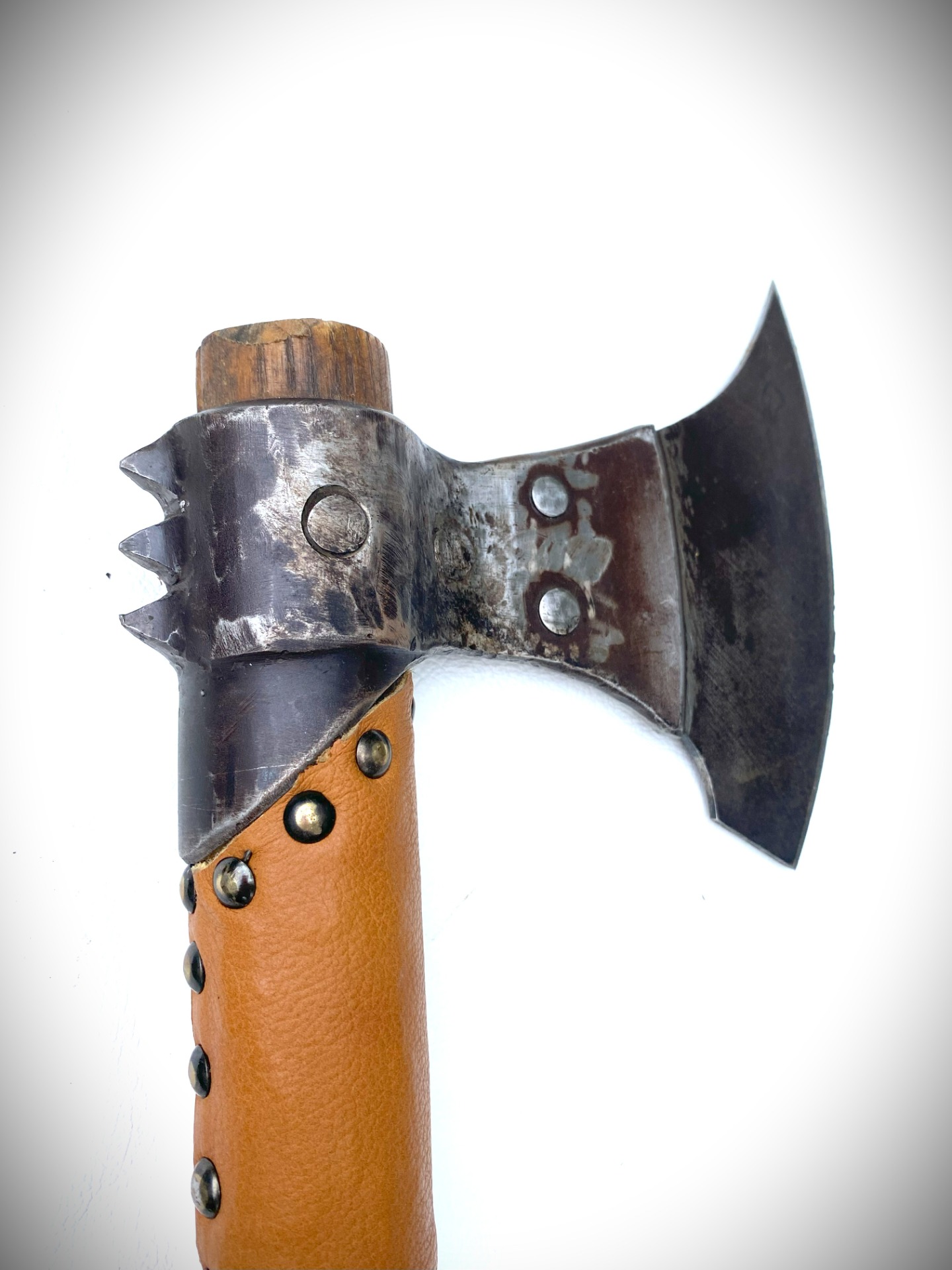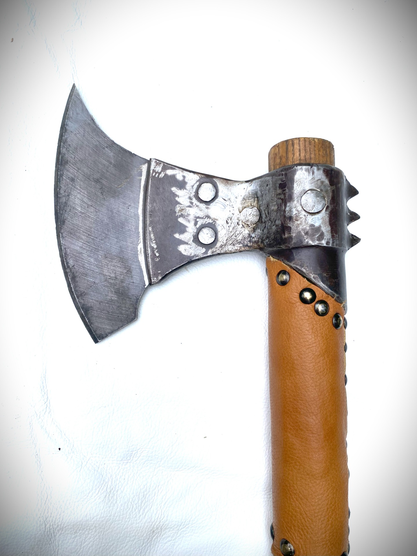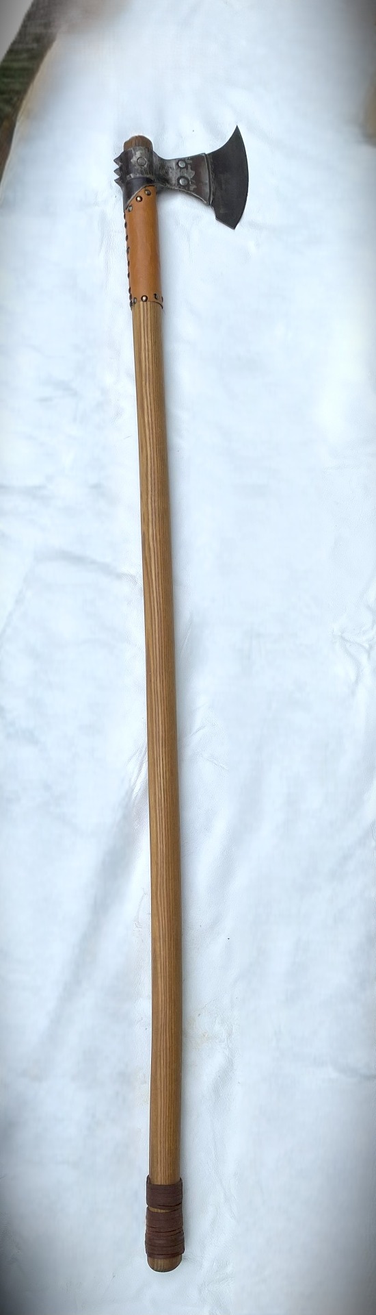 Historická sekera Dánska dlhá, obojručná, ručne kovaná, ostrá. Materiál oceľ, rúčka jaseň, zdobenie koža. Púzdro koža.