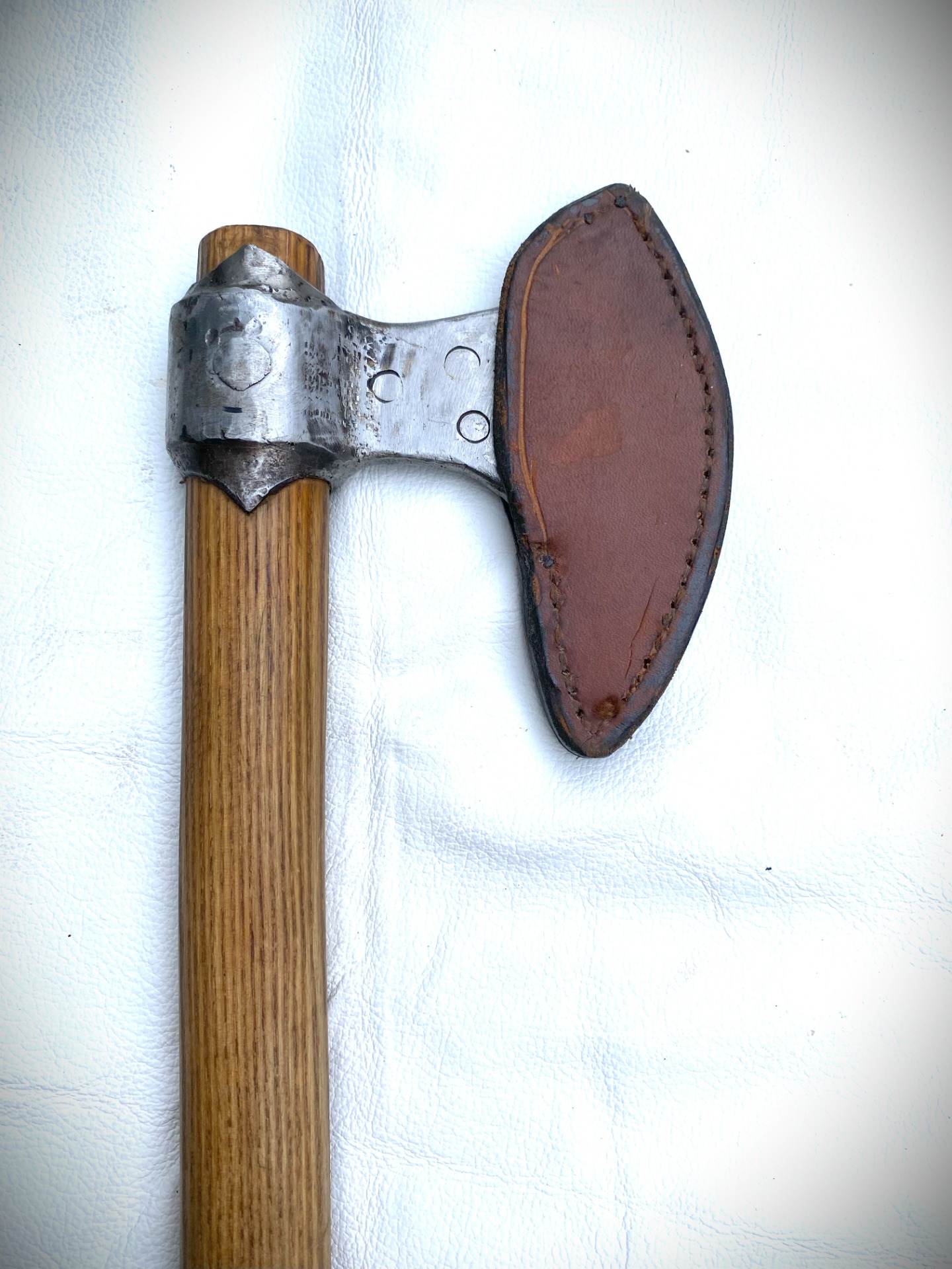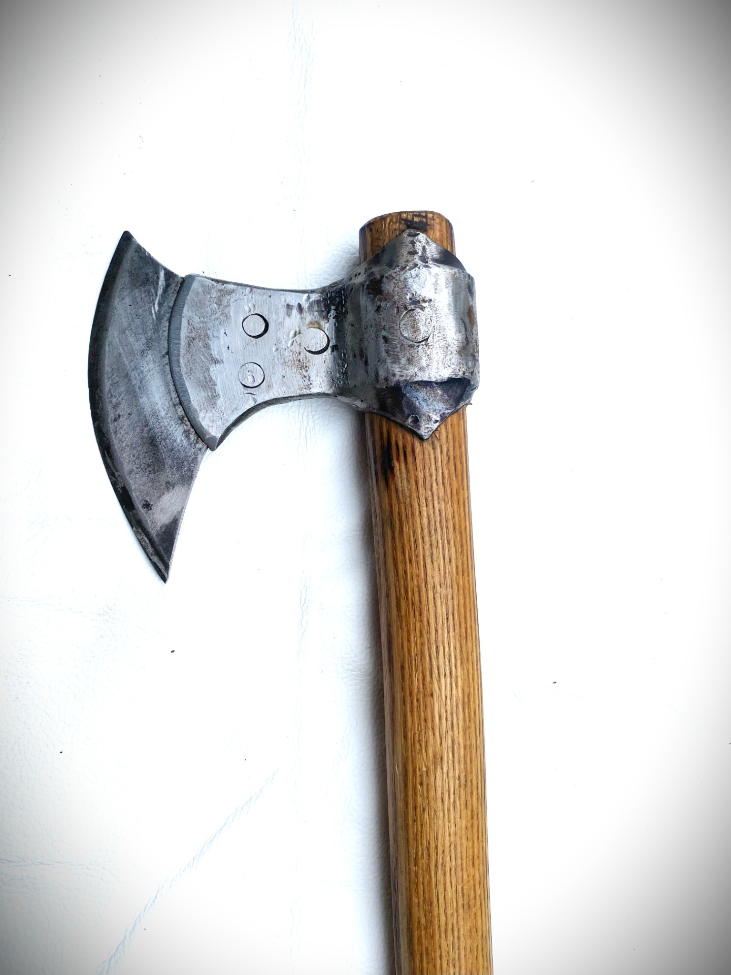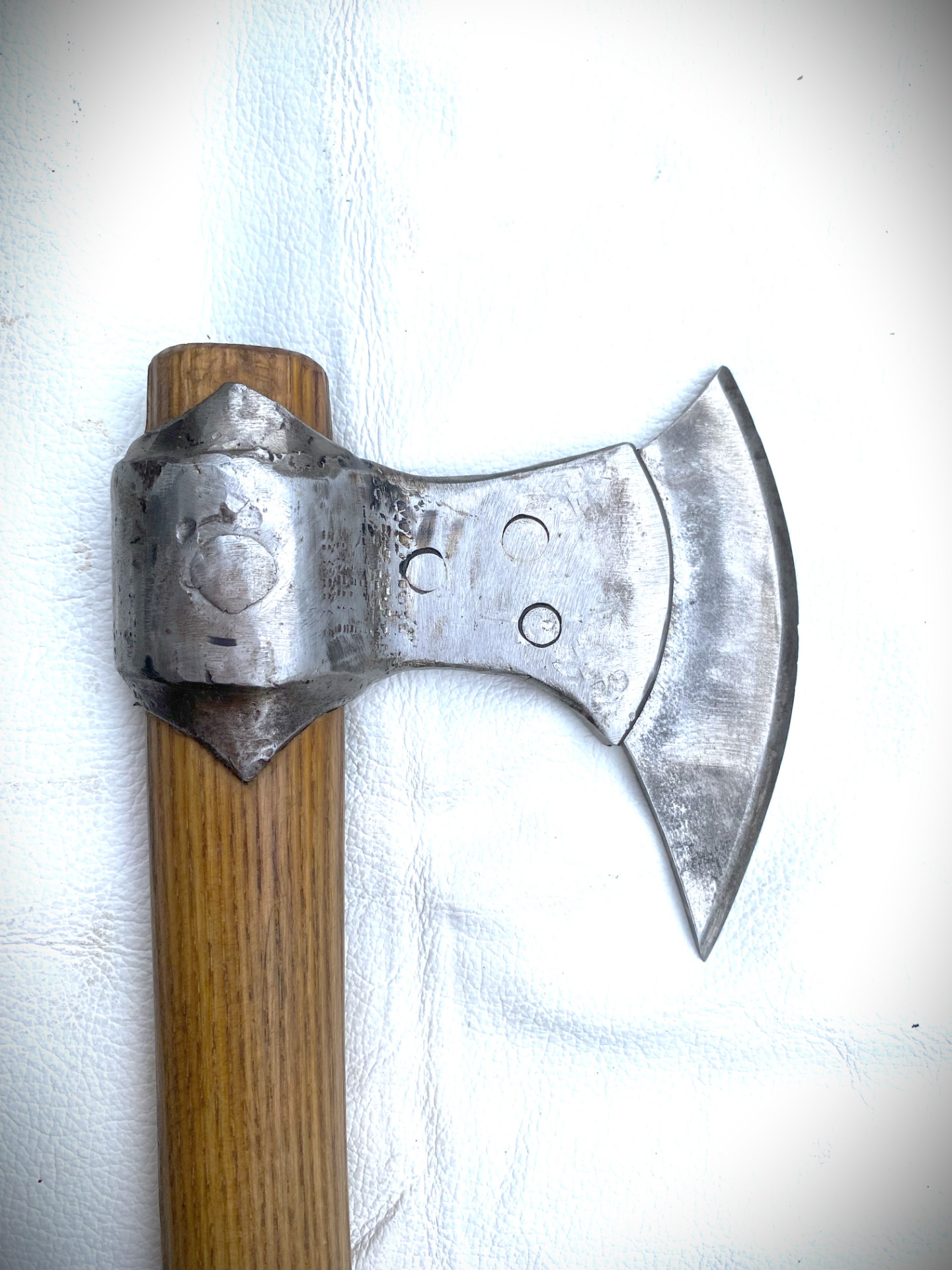 Historická sekera Dánska krátka, ručne kovaná, ostrá. Materiál oceľ, rúčka jaseň. Púzdro koža.