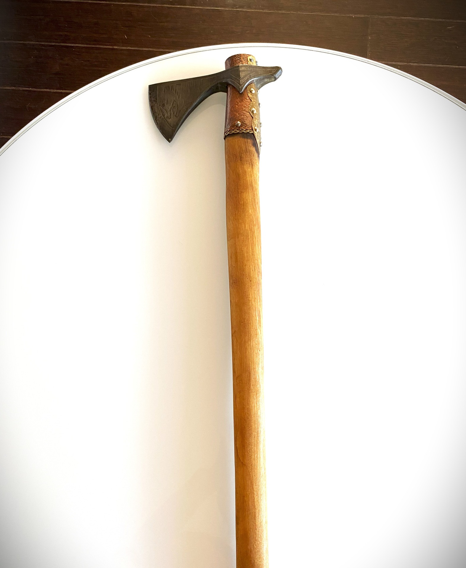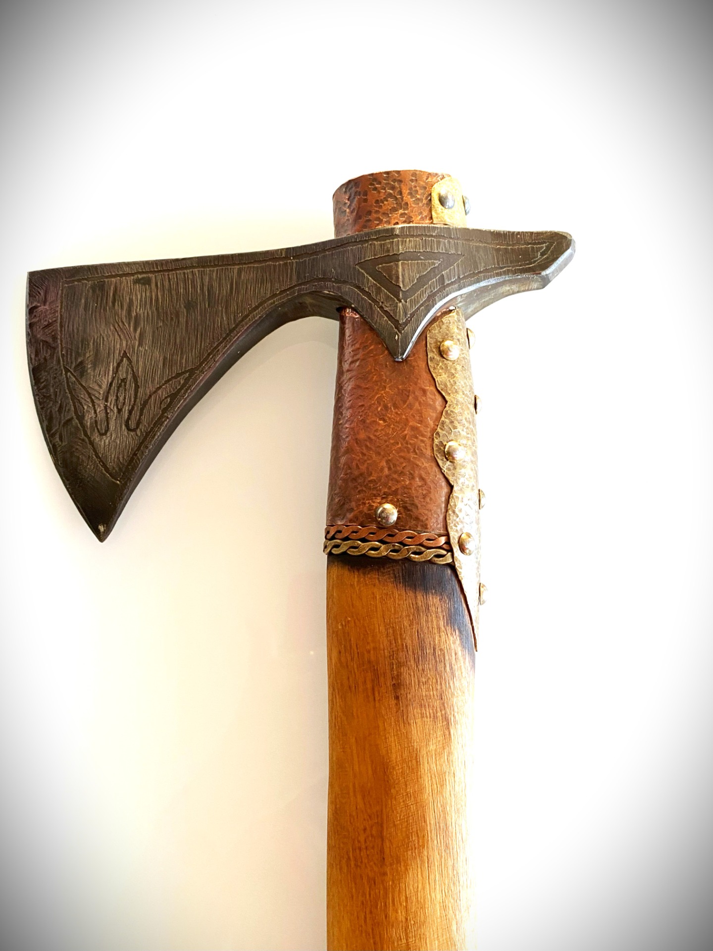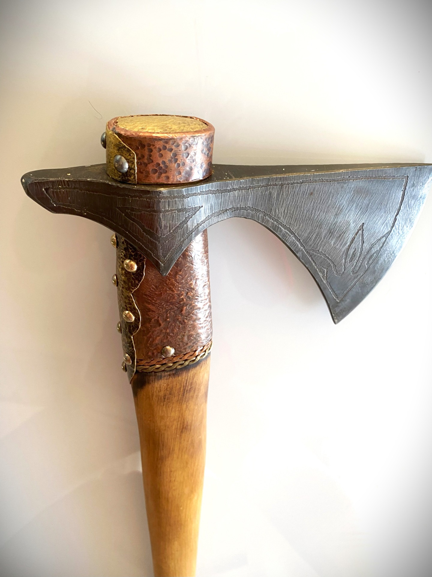 Historická sekera VARIAG ručne kovaná, materiál oceľ, rúčka buk. Veľmi ostrá a pevná. Zdobenie kombinácia mosadz a meď.