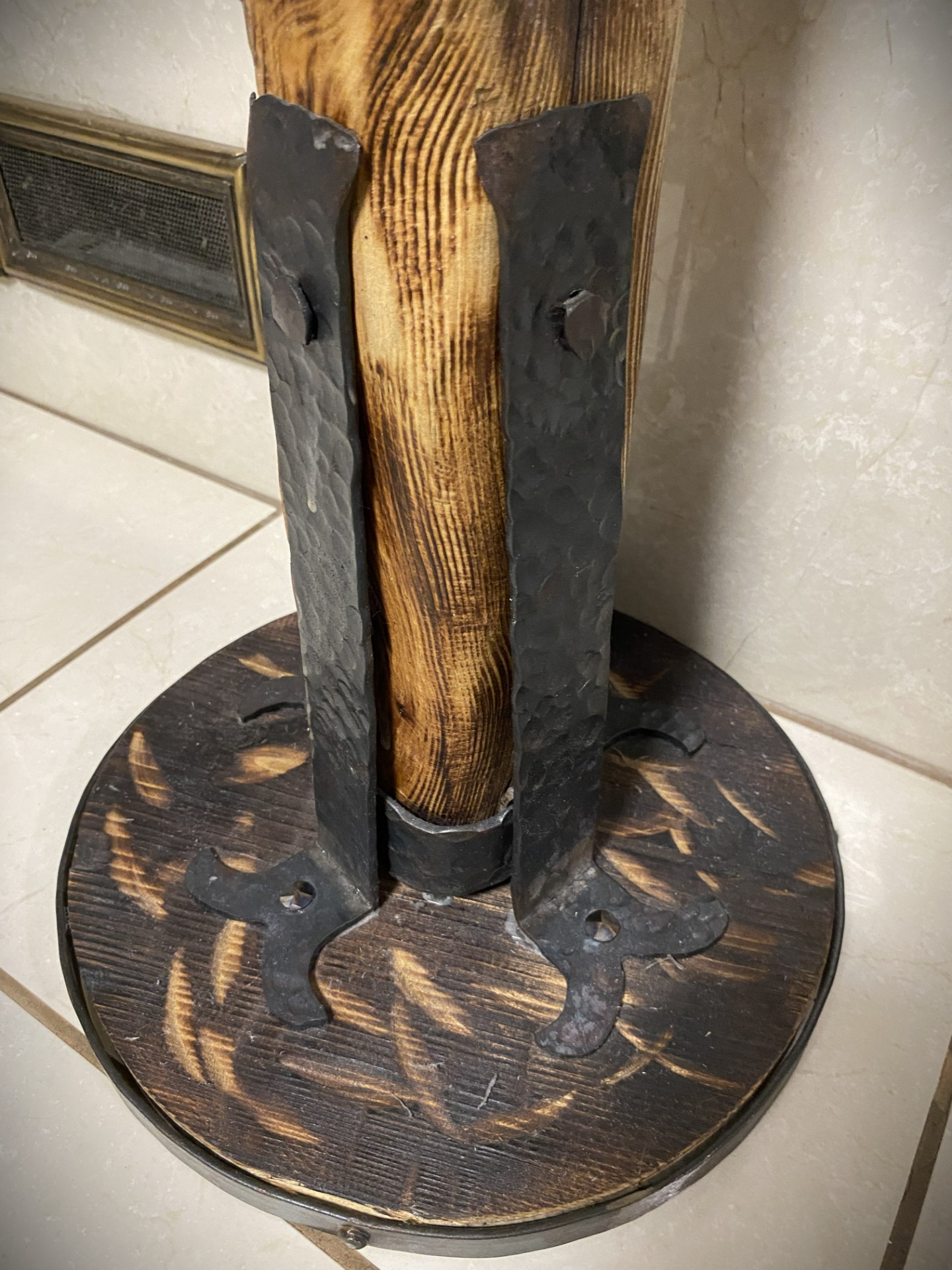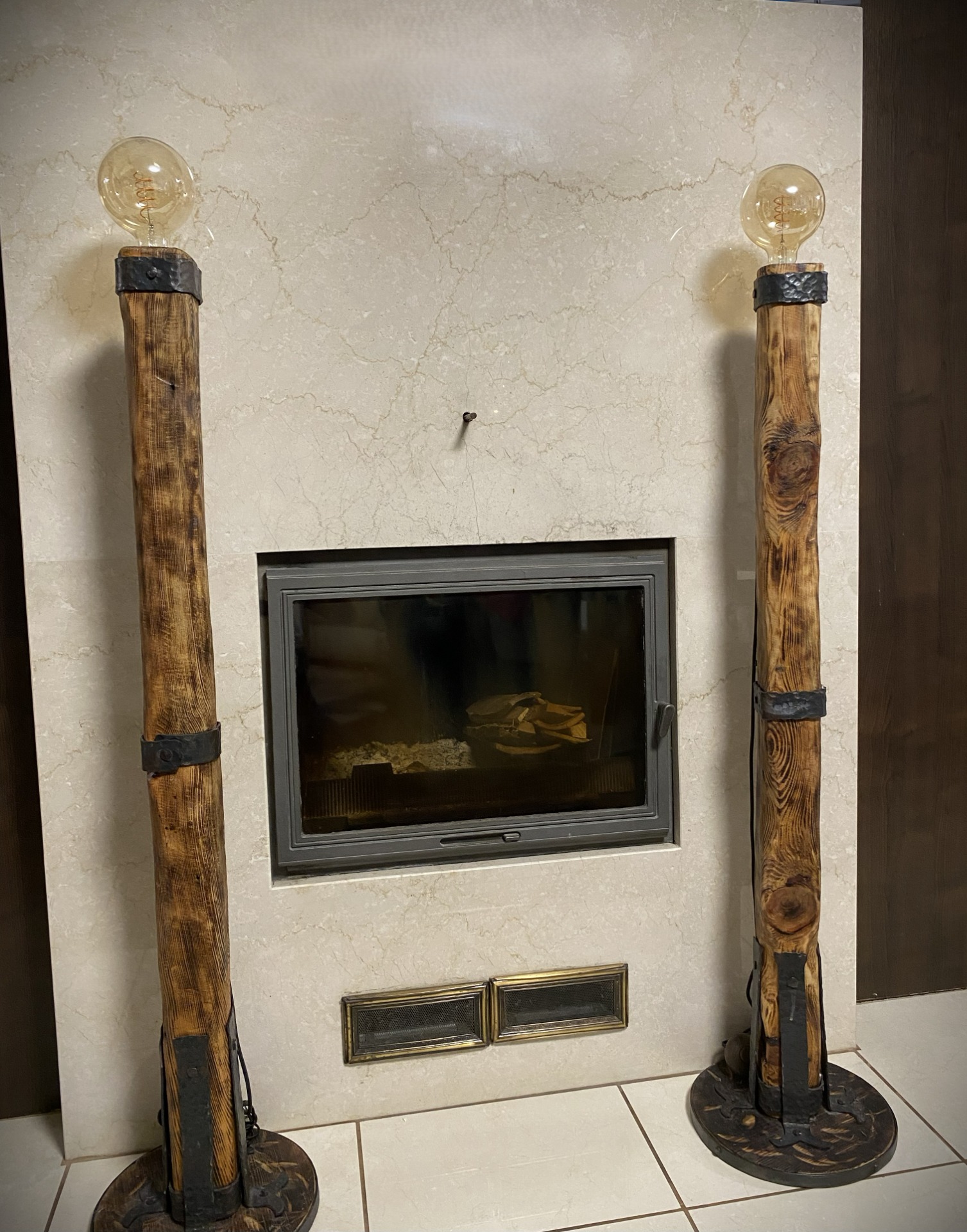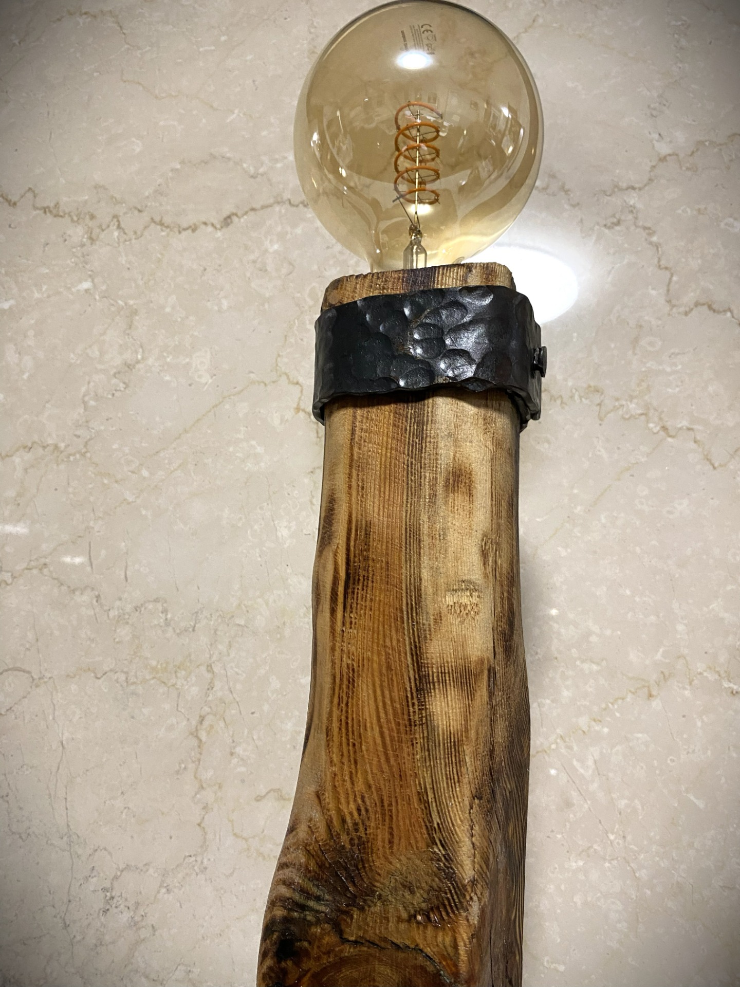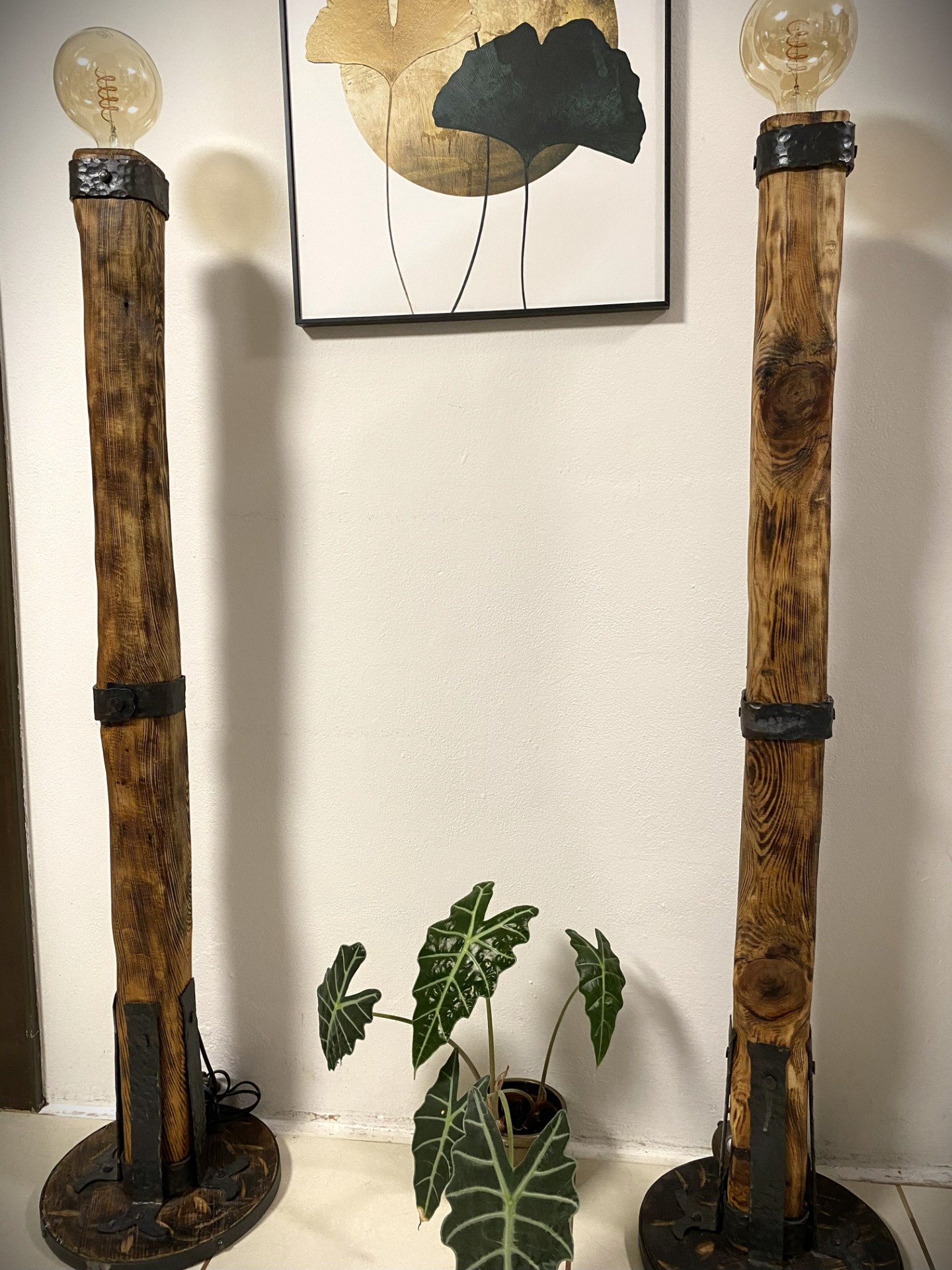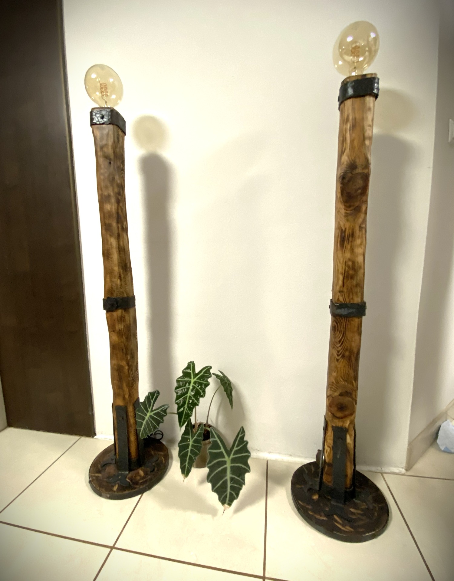 Drevené svietidlo stojace 2 ks, opaľované drevo, spevnené a zdobené kovaním. Teplé svetlo. Doporučené na presvetlenie predsiení, chodieb, krytých terás a pod.